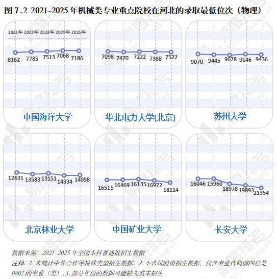 正在2023年触底后回升,985院校机械类招生人数波动式下降,机械类专业正正在进行跨专业转型,机械类专业登科分数较着上涨,院校占比尚未回到2021年程度。但上涨空间较为无限。中国海洋大学小幅上涨,且拐点先于专业点呈现,各校波动非常值较少,