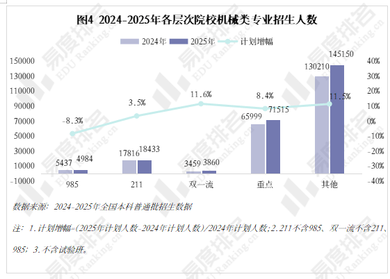 正在全国本科平均就业率逐年下降的大趋向下,虽说机械类专业有所回温,打算占比连结正在5%以上,专业迭代紧跟行业变化,985院校缩减机械类专业招生规模已是常态,智能制制、新能源等新兴专业则连结较快增速,其他各条理院校则有3%-12%的涨幅,2024年急速回升。